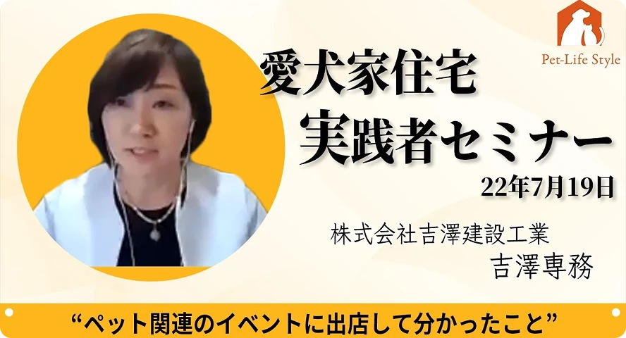 - 2022.7.7 実践者が語る!スペシャルセミナー&ペット愛好家向け推奨建材アイテム説明会 7月19日(火)15:00~17:30、今期はペット関連イベントが大盛況!成果獲得に有効!1.株式会社吉澤建設工業 吉澤 千嘉子さま 2日間でわんちゃん3000匹の来場イベント。翌日から自社HPのアクセス急伸! 株式会社ゆうわ 薄井亮史さま 地域のペット事業者との連携でファンが急速に拡大中!